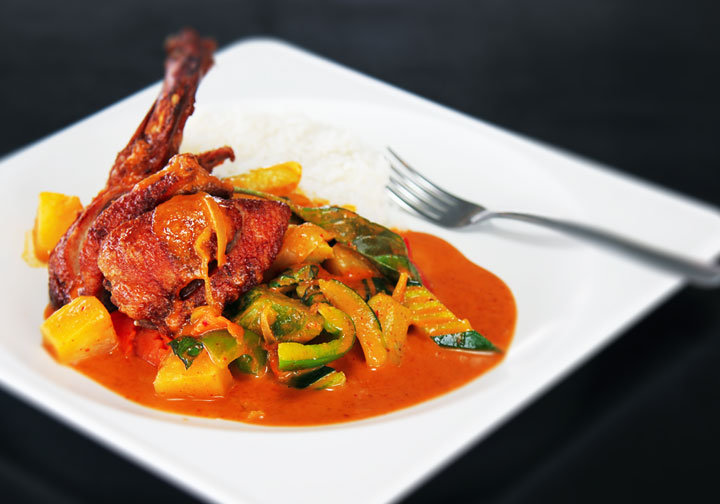 Published April 14, 2020 at 720 × 504 Pineapple Duck Curry Coconut milk yellow curry with Crispy Duck, bell pepper, basil and pineapple
