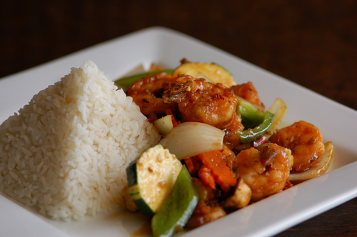 Published March 4, 2013 at 500 × 332 Shrimp Cashew Marinated shrimp and cashews flash-fried with assorted veggies finished with a sweet chili sauce.