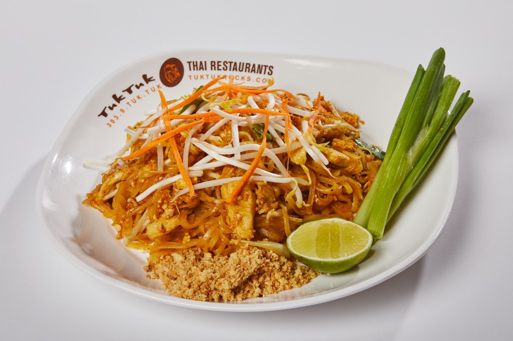 Chicken, thin rice noodles, egg, bean sprout, crushed peanuts, green onion, carrot topping